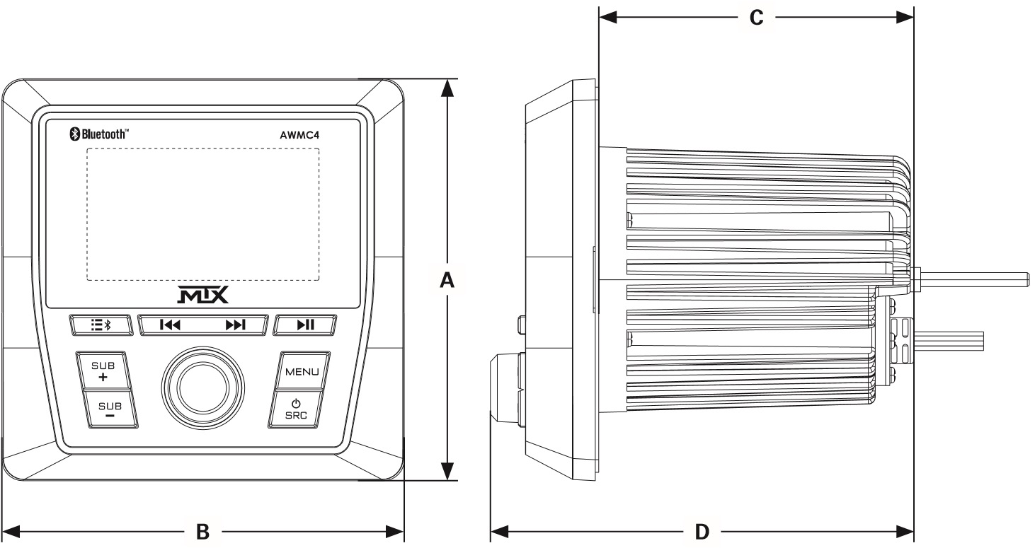 The AWMC4 is built for clear operation in demanding environments and supports multiple audio sources including Bluetooth, radio, AUX, and USB memory stick playback. It features a 3" full color display and expanded output controls suited for a wide range of system setups.