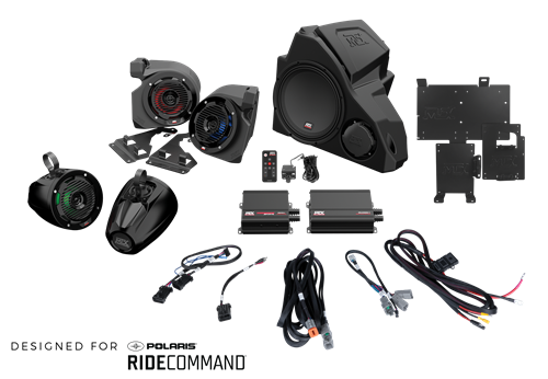 The RZR-14RC-THUNDER5 audio kit is a complete plug and play 5-speaker audio system designed for the Polaris RZR platform. This kit fits models that have installed RideCommand systems*. The package includes a set of the RZR-14-FS front speaker pods and a pair of MUD65PL speaker cans both featuring integrated RGB lighting and the RZR-14-SW subwoofer enclosure. The included MUD100.4 4-channel amplifier and a MUD600-1 monoblock amplifiers connect to the Ride Command system and provide power to all speakers via integrated harnesses that simplifies the installation, which gets you get out of the garage and back to riding quicker.